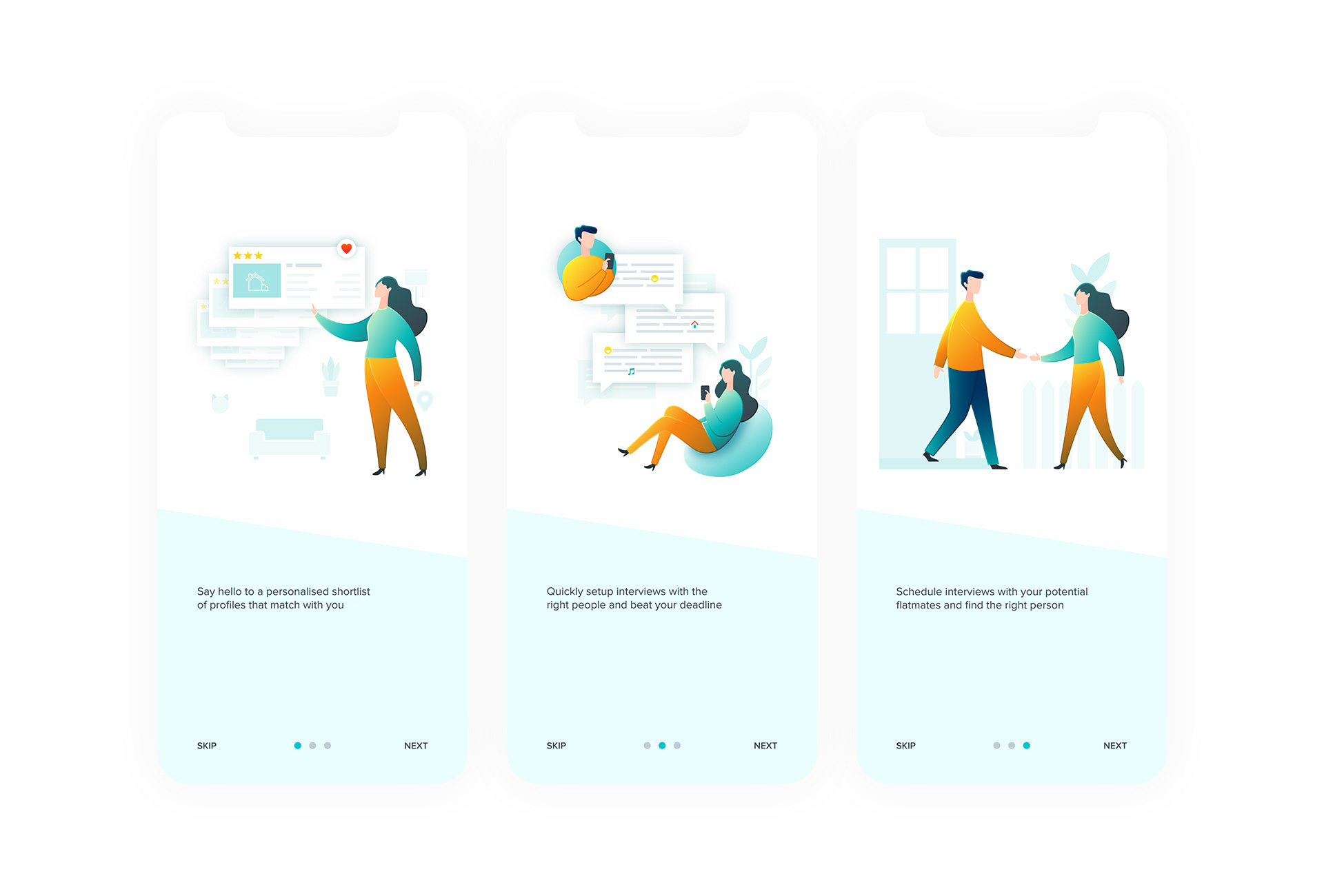 Illustrations and mobile onboarding screen design for Flatmate Finders (Australia) and Gay Share (Australia) applications